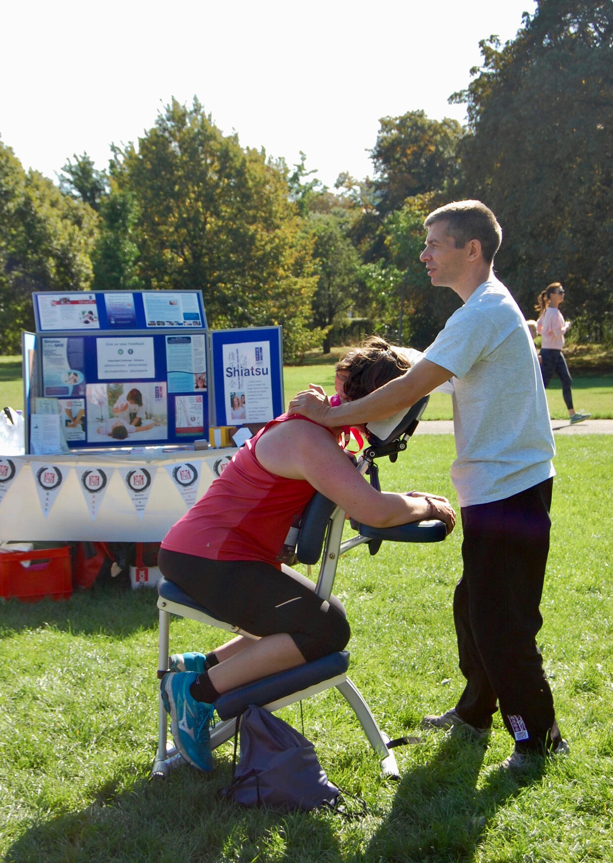 A chair massage or seated acupressure session typically lasts between 10 to 30 minutes.This abbreviated Shiatsu treatment is conducted on a comfortable massage chair and primarily targets tension relief in the neck, shoulders, and back. It is particularly beneficial for individuals who spend extended hours at a computer or for those who may not have time for a full futon treatment.The convenience and efficiency of a chair massage make it an ideal choice for busy professionals seeking quick rejuvenation during their lunch break or in between meetings. The practitioner uses a combination of gentle pressure, kneading, and stretching techniques to release built-up tension and improve circulation, leaving recipients feeling refreshed and more focused. Additionally, this form of massage can help reduce stress levels, enhance mood, and promote overall well-being, making it a popular option for wellness programs in workplaces or community events.